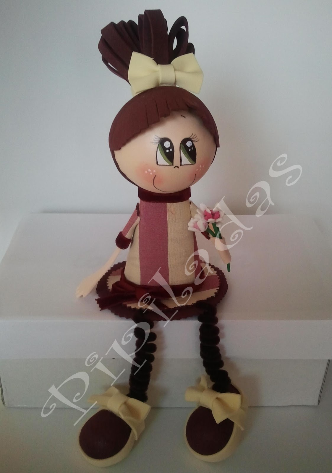 Muñeca para poner sentadita en una balda, una caja o donde quieras, porque sus piernas cuelga de forma graciosa. En tonos granates, con un vestido forrado en tela y lazos de terciopelo, una bonita coleta y hasta un ramo de flores en la mano. Tamaño de la falda hacia arriba aprox. 20 cm. Precio 17 €