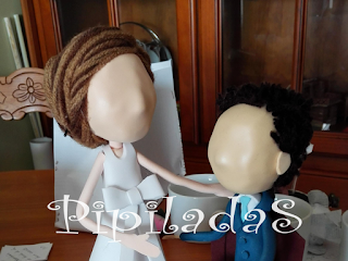 A diferencia con las fofuchas más comunes, en éstas las cabezas se hacen igualmente con bolas de poliespan, pero se esculpen ayudándonos de cutter, haciendo la nariz, barbilla, ojos, etc. Eso les da un aire más real. Y tendremos que tener en cuenta también como son los novios reales, para hacerlo lo más parecido posible. Para el cuerpo utilizaremos alambres y poliespan y luego lo forraremos con foami. El pelo se hace con lana.